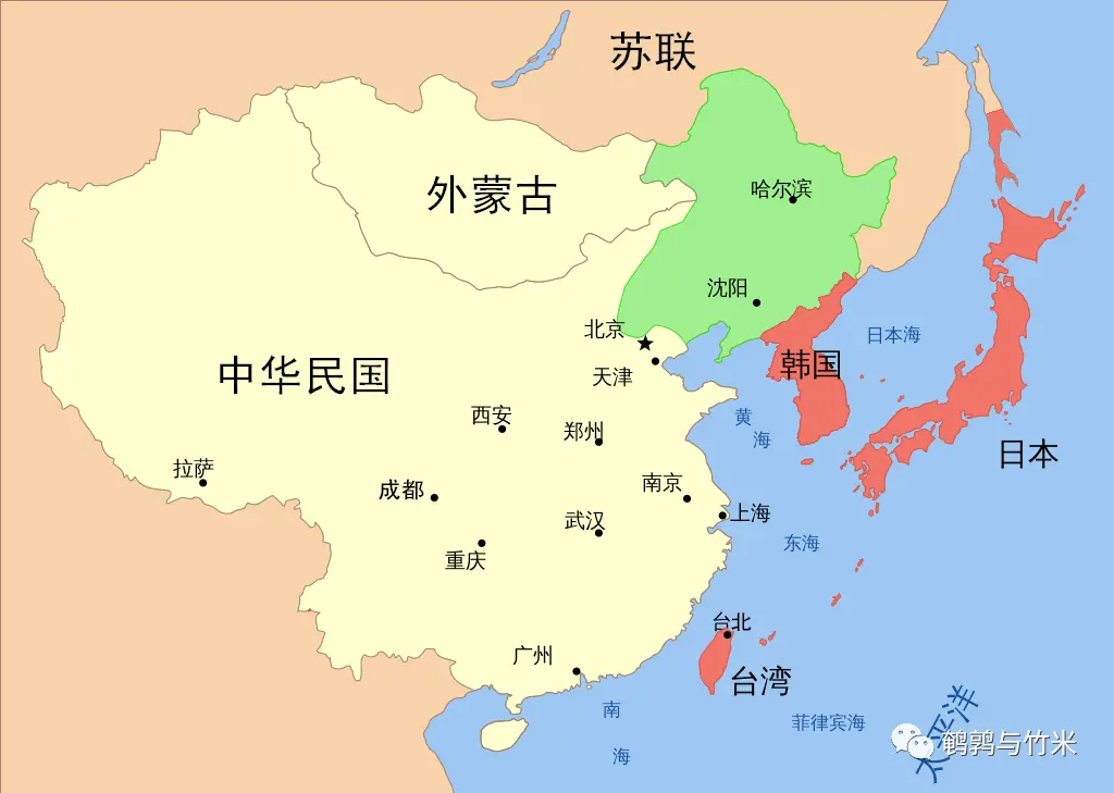 日本扶植的“满洲国”控制范围和日本及其侵占的中国殖民地位置示意图