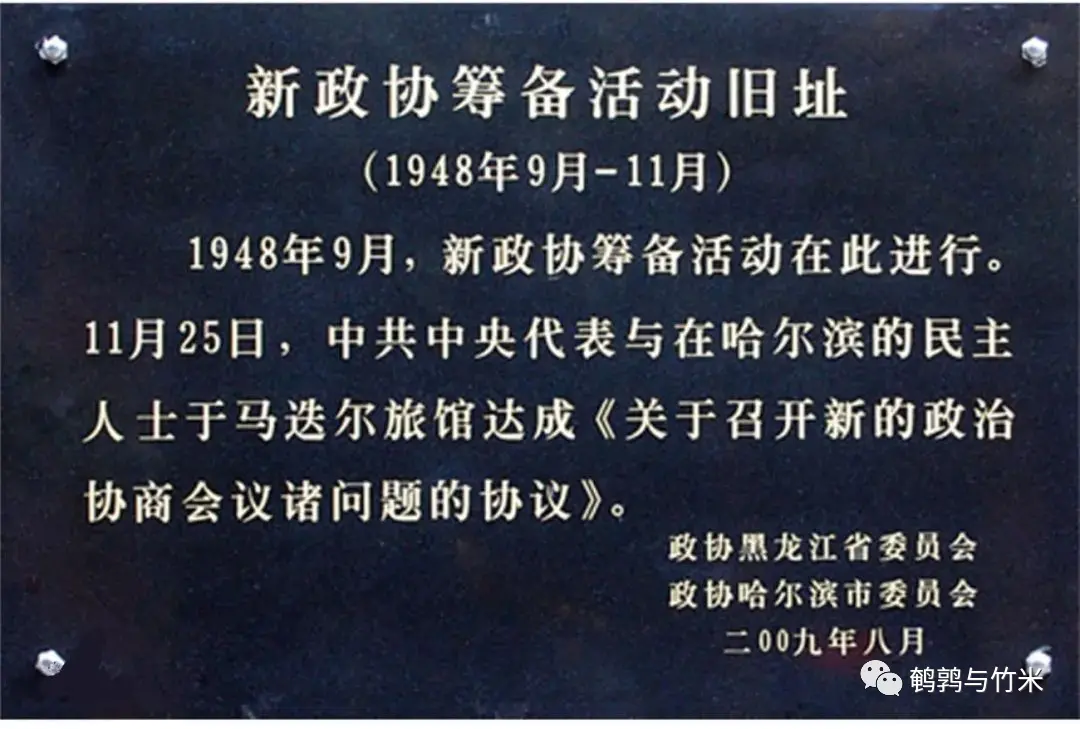 1948年10月,民主人士沈钧儒、章伯钧、谭平山、蔡廷锴等抵达哈尔滨,下榻马迭尔旅馆,与中共东北局负责人林彪、高岗、李富春、张闻天等进行了多次会谈。此后不久,李济深、何香凝、沙千里、柳亚子、马寅初等40余位知名人士也到此举行多轮会议,为新政协筹备会建言献策。
