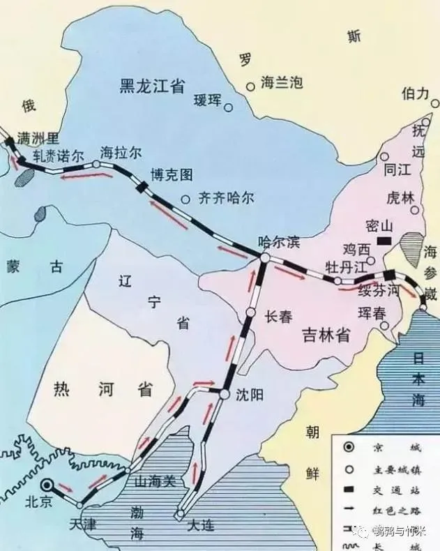20世纪初的中国东北。图中满洲里到海参崴的铁路线即是有名的“中东铁路”。从长春到大连的铁路线就是日本方面记述中经常提到的“南满铁路”。