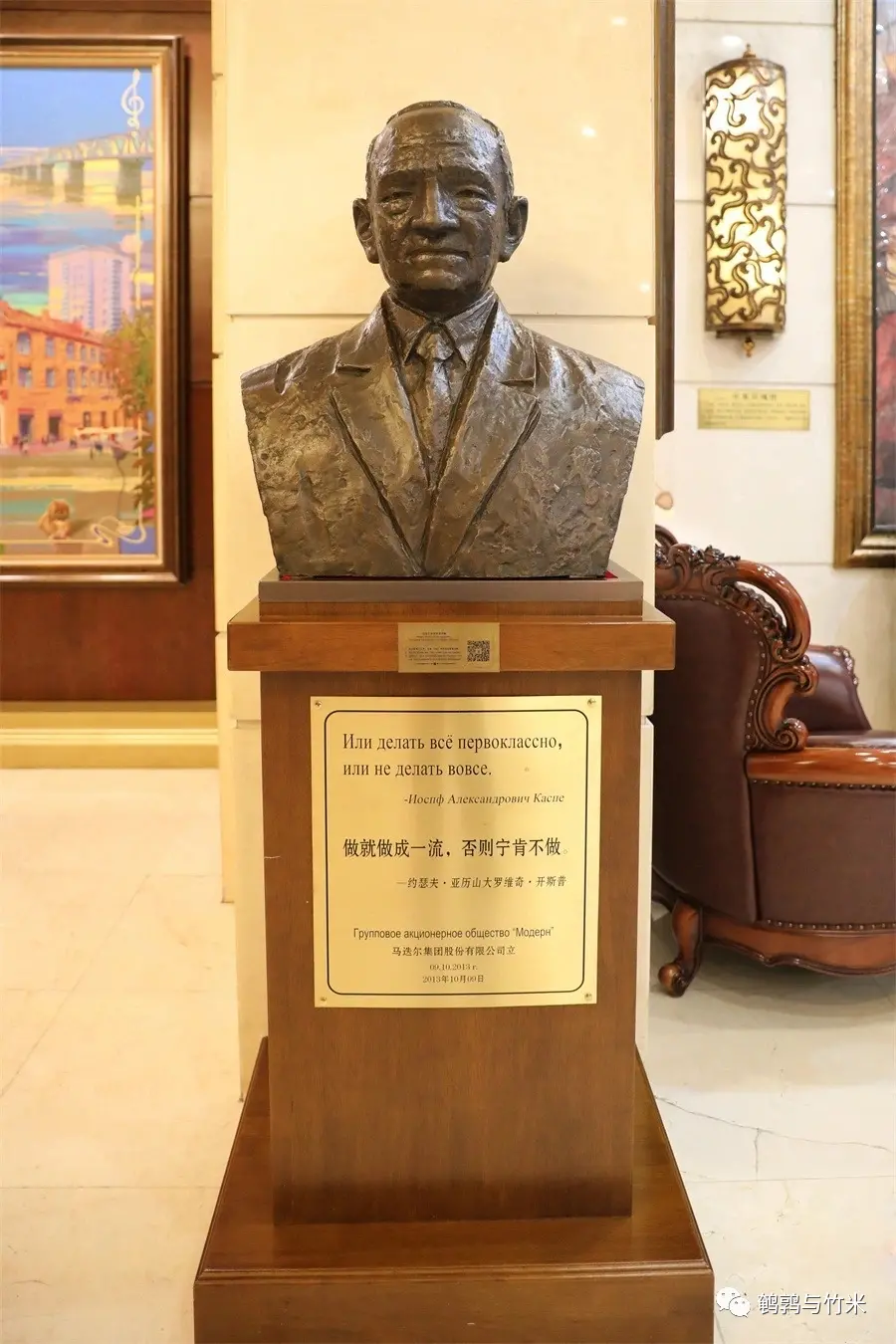 如今马迭尔旅馆大堂内的老卡斯普半身像。基座上镌刻着这位百年老店创始人的名言:“做就做成一流,否则宁肯不做”。