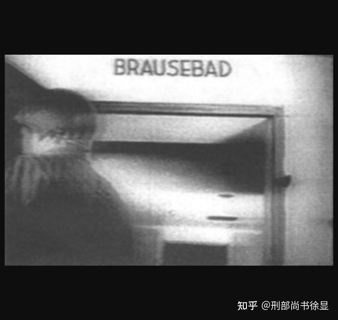 上面这张图片一名美国士兵打开了达豪集中营伪造的“毒气室”的门。1994年3月,这部1945年美国宣传片的片段在《60分钟》和《唐纳休》电视台向数百万观众播放,作为德国人在毒气室屠杀犹太人的“证据”。