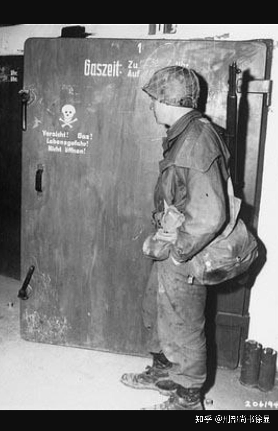 但现在,突然间,悄悄地,同样可怕的惊喜降临了,就像那些以为会被热水喷洒却吸入致命气体的女人一样……内林•冈恩在回忆录中翻印了一张为人熟知的美军照片:一名美国士兵站在所谓的达豪毒气室前。冈恩在回忆录中配文: