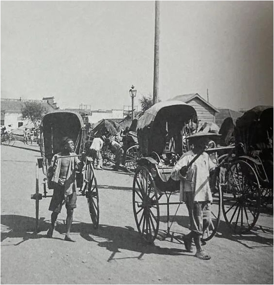 人力车最早于1870年在日本横滨出现,它是一种依靠人力拖拉行驶的交通工具。直到19世纪末人力车才出现在汉口租界的街头。由于该车最早从日本引入,因此又被称为“东洋车”。人力车进入汉口后,很快就兴盛起来。20世纪初期,汉口拆除汉口堡城墙修建起后城马路后,汉口城区得到进一步扩大,人力车又开始在华界流行起来。早期人力车车轮为木质结构,外包铁皮。由于缺少减震装置,车辆行驶起来,车轮与地面相碰,颠簸较为厉害。即使这样,与旧式轿子相比,仍新颖便捷不少,人力车迅速成为人们热衷乘坐的交通工具。乘坐人力车逛街欣赏沿街风景成为时髦风气。正所谓“玉带城门剩旧楼,东洋车子快归休。歆生路口人争换,道是洋街一码头”。1901年,仅在汉口租界工部局正式登记的人力车就有1000辆。