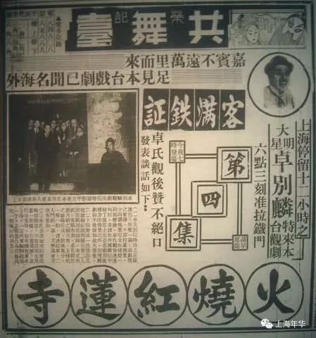 张善琨引领卓别林一行踏进了共舞台右边的花楼入座,观赏连台本戏《火烧红莲寺》第4集。