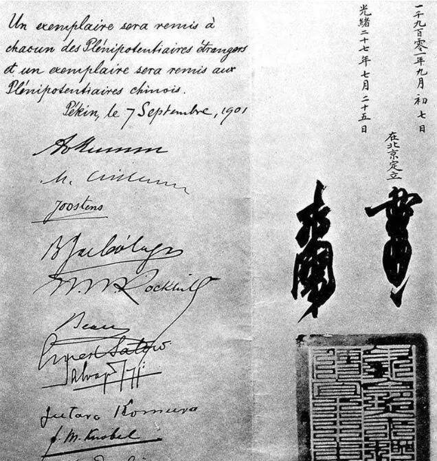 上图_ 各国在《辛丑条约》上的签署,以及李鸿章(左侧)和庆王(右侧)签署的都是花押(画押)