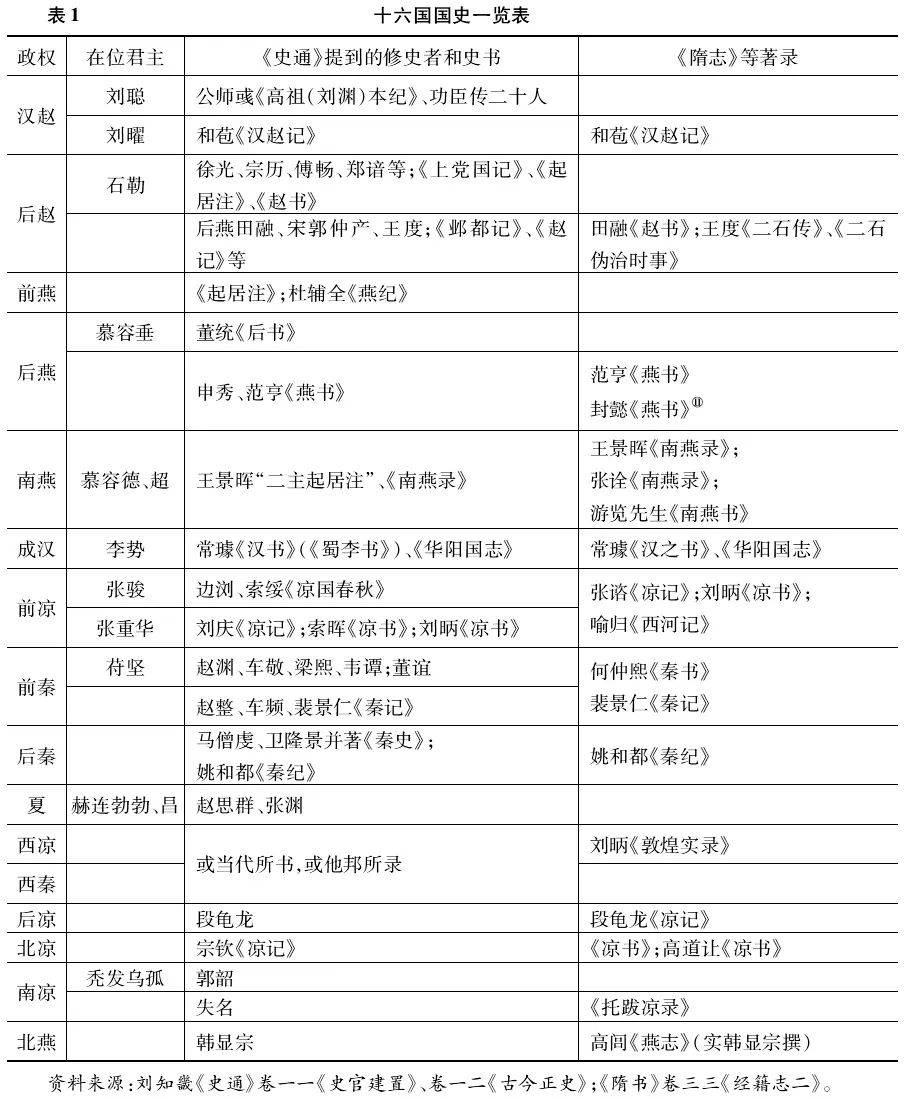 其中“各有国书”、“因其旧记”两条特别值得注目,这说明崔鸿的著述对象是已经修撰了“国书”且其“旧记”能够被搜集到的政权。十六国诸政权的国史修撰情况,根据刘知幾在《史通》的《古今正史》和《史官建置》两篇中所举,⑨辅以《隋书·经籍志》霸史类的著录,⑩再参以其他史料,可以知其大略。如下表所示: