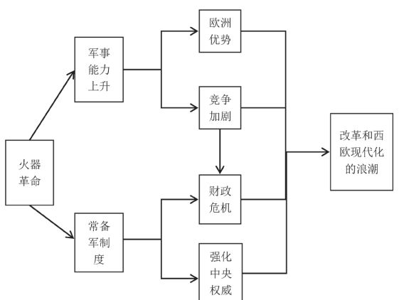第二种理论认为,技术革命通过影响国家内部的组织形式,强化了国家能力,有利于实现现代化。迈克尔·霍华德(Michael Howard)认为,真正有意义的变化不在于军队所持有的武器,而在于军队建设本身以及使用它的政府。布莱恩·唐宁(Brian Downning)认为,战争烈度影响到国内的动员程度,最终决定了制度的差异。托马斯·埃特曼(Thomas Ertman)阐述了高强度的国际竞争与国家建设的时序如何影响制度安排。约翰·查尔兹(John Childs)通过对整个欧洲战争史的详尽叙述,展现了三十年战争后军事变革对王室和贵族关系、国家能力变化乃至18世纪后期革命运动的影响。