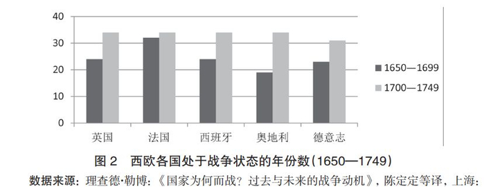 欧洲各国军事力量增长和战争的边际成本下降,加剧了国际竞争。率先在军事技术变革中获得相对优势的国家会更加倾向于使用武力。欧洲出现了螺旋式的军备竞赛,各国军队规模不断扩大。1702—1714年间,法国有10%的适龄人口参加正规军;七年战争期间普鲁士的参军适龄人口则达到了25%。当法国的军队人数高达20万时,奥地利、普鲁士和俄罗斯只能随之扩军,其他小国也被迫效仿。频繁的战争是竞争加剧的重要标志。图2展示了西欧主要国家在两个时期处于战争状态的年份,第一个时期大约是从1648年威斯特伐利亚体系确立到1699年之间,第二个时期则是从1700年西班牙王位继承战争爆发到七年战争前夕,两个时间段都接近50年,而第二个时期西欧主要大国的战争频率明显高于第一个时期。1740年奥地利王位继承战争爆发后,战争形式发生了重大变化,普鲁士和奥地利从有限战争逐渐转向全民动员,开始了以民族国家为单位的战争,进一步增加了国际竞争的烈度。