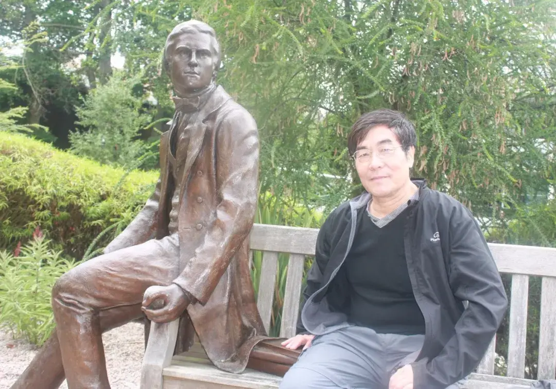 笔者在剑桥基督学院达尔文铜像旁,2013年7月30日 徐义保摄