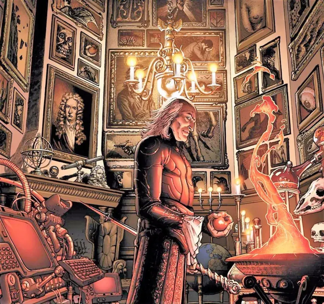 下图同样来历不明,笔者认为讲“别样”的牛顿缺它不可:一个貌似炼金术士的人凝视着熊熊燃烧的炉火,一手拿着红苹果,一手握着魔杖,炉旁还有一个地球仪,火焰的上方可见远古动物的残骸和烧瓶,瓶中的液体已经沸腾;此人身后是一堆乱七八糟的现代器具——键盘、操纵杆、屏幕等等,全被炉火映得通红;上面的壁台摆着浑仪、水晶球和望远镜,墙上则挂满了形形色色的图画,紧靠壁台的正是内勒1702年画的那幅牛顿像。画中人,或者牛顿,正如凯恩斯(John Keynes,1883-1946)那篇出色的《牛顿其人》所言:“这是一个奇特的灵魂:他受到了魔鬼的诱惑,当他在这些围墙之内解决如此众多的问题时,相信自己利用纯粹的心智力量就能破解上帝与自然的所有秘密──集哥白尼与浮士德于一身。”