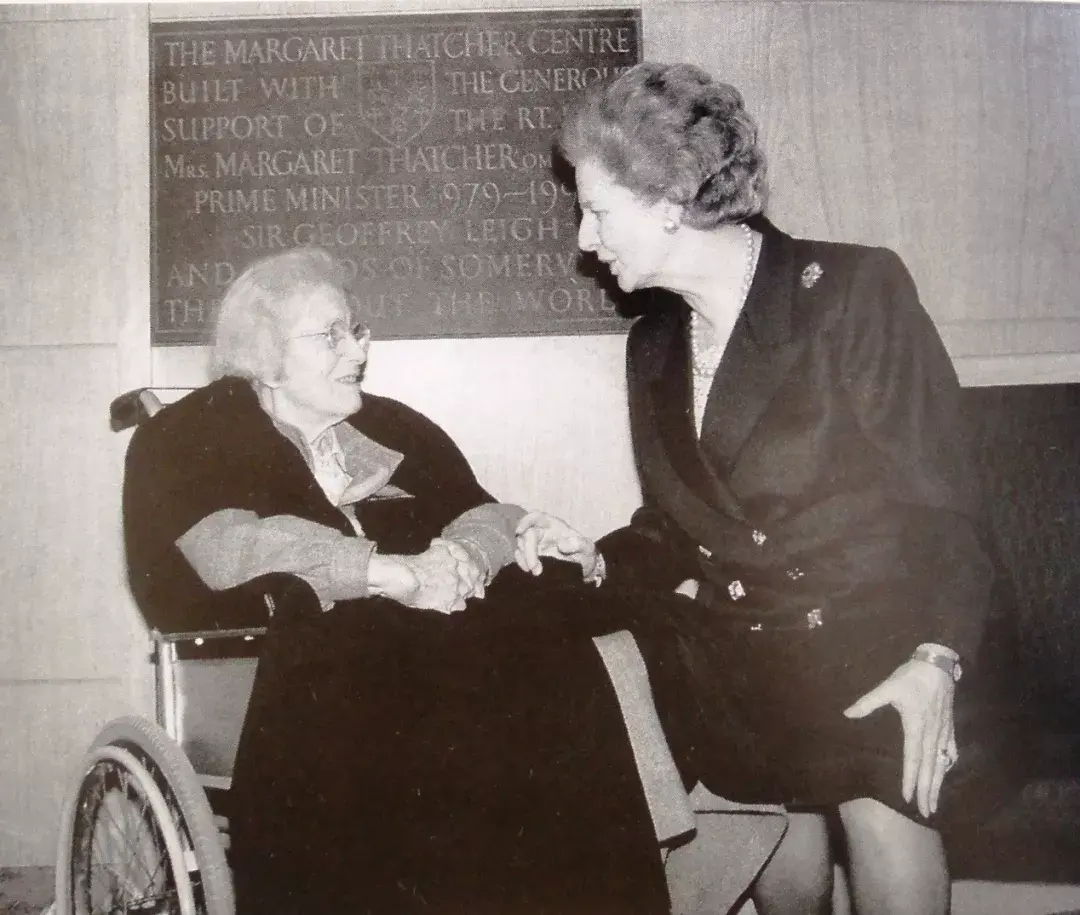 多萝西与自己的学生、刚刚卸任首相的撒切尔夫人亲切交谈,1991年牛津 图片来源:维基百科