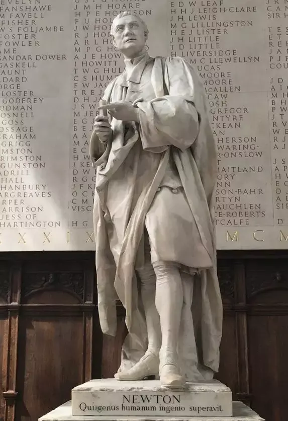 最后我们来看两尊雕像。前一个对许多人并不陌生,它被安置在牛顿母校三一学院的礼拜堂前厅,任何人一进门就能看见。雕像底座牛顿的名字下面是一行拉丁文Qui genus humanum ingenio superavit,出自罗马诗人卢克莱修《物性论》所引伊壁鸠鲁的格言,大意是“这个人在智力上超越了整个人类”。