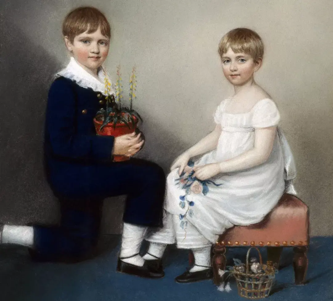 夏普里斯《达尔文和妹妹艾米丽》(1816)水粉画,收藏处不详