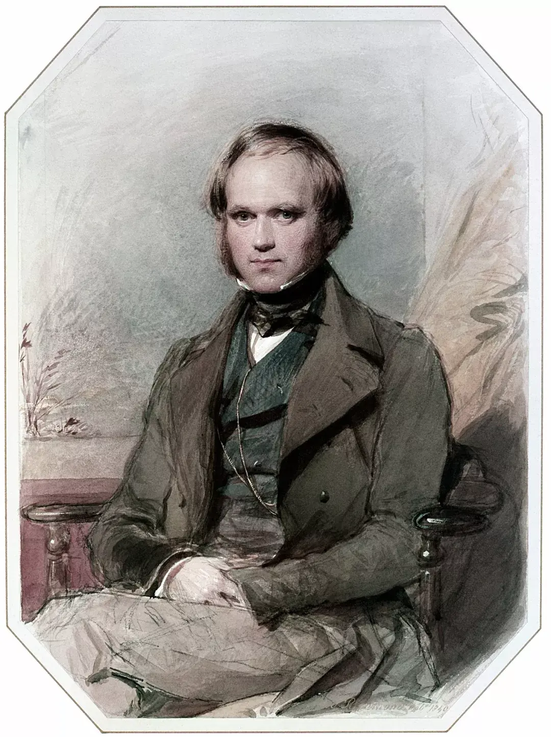 下图是达尔文的青年画像,绘于1830年代末,应该是在乘坐“小猎犬”号巡洋舰完成环球考察之后不久。画面中的达尔文给人留下的最深印象是宽大的额头与炯烁的双眼,看似随意的着装掩饰不住他的高贵气质。尽管当时达尔文在学术圈已崭露头角,但是普通公众还不知道他的伟大发现。画家名叫里奇蒙德(George Richmond,1809-1896),是皇家美术学院成员。