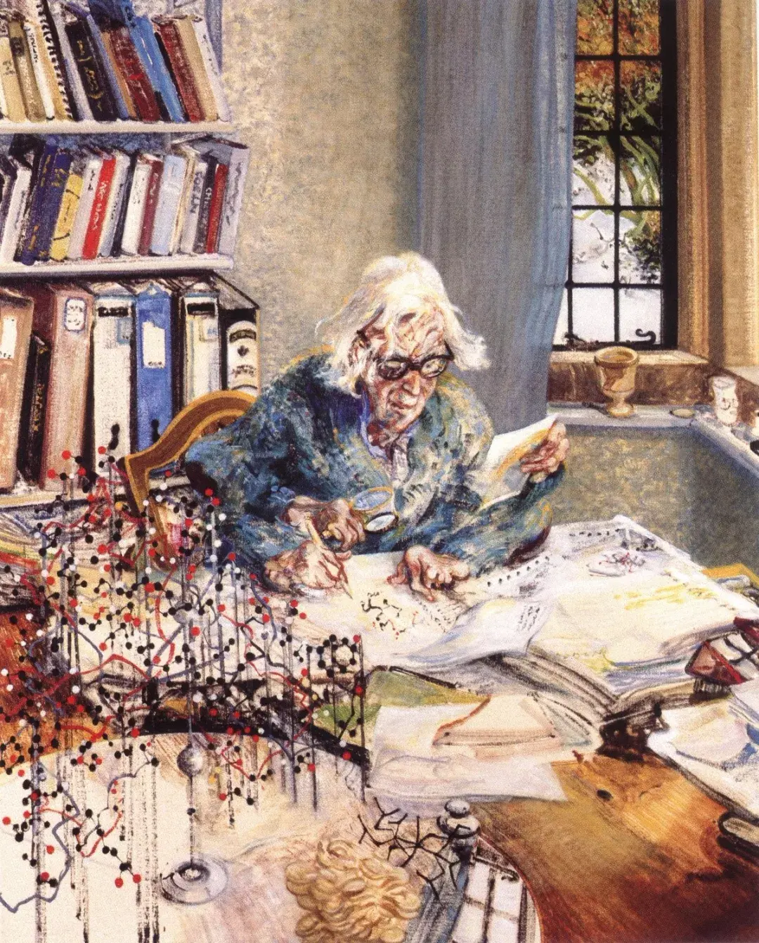 在伦敦的英国国家肖像馆里,有一幅英国当代女画家及雕塑家哈姆布林(Maggi Hambling)的奇特作品:画面中的女子正在一张超大的写字台前忙碌着,台面上摆满了论文和图表,还有一个大分子结构的模型,身后的书架上装满了书籍和档案,她的头发夸张地飘散开来,身前的四只手同时干着不同的事情:一手握笔书写,一手拿放大镜,一手举着图片,一手指向铺在台面上的数据表。活脱脱一个女魔法师的形象!