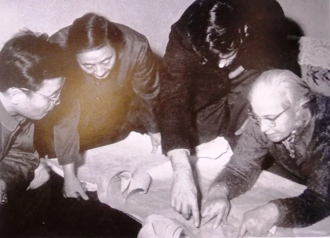 多萝西与中国科学家一道观看牛胰岛素的晶体结构图,1977年北京 图片来源:Ferry 1998