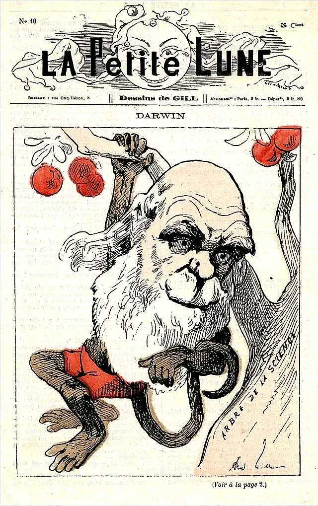 下图是1870年代巴黎出版的《小月亮》杂志上的一幅漫画:一只脸部像达尔文的猴子单臂吊在结满果实的树枝上,另一只手挎着自己的长尾巴,树干上的一行法文字是“科学之树”。
