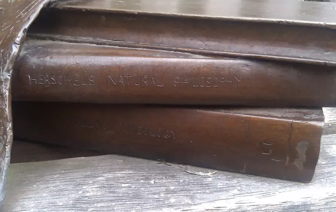 与人们熟悉的达尔文形象迥然不同,这尊铜雕呈现的是一个风流倜傥的英俊小生模样,身穿三件套正装,系着蝴蝶领结,脚蹬长筒马靴,手里拿着一本书,放松地倚坐在一个长椅的扶手上,长椅上还散落着另外几本书。从年龄与装束来看,这尊雕像十分符合达尔文在学院的本科生身份,与文献记载的当时他的精神面貌也有几分神似。仔细观察那几本书,可以发现,达尔文右手拿着的正是洪堡的《美洲旅行记》,压在最下面的一本是斯蒂芬斯(James Francis Stephens,1792-1852)的《英国昆虫图志》(Illustrations of British Entomology),上面是赫歇耳的《自然哲学的初步研究》,最上面的那本则是帕累(William Paley,1743-1805)的《自然神学》(Natural Theology)。所有这些书籍,都是青年达尔文在剑桥求学时读过的,也深刻影响了他日后的科学生涯。