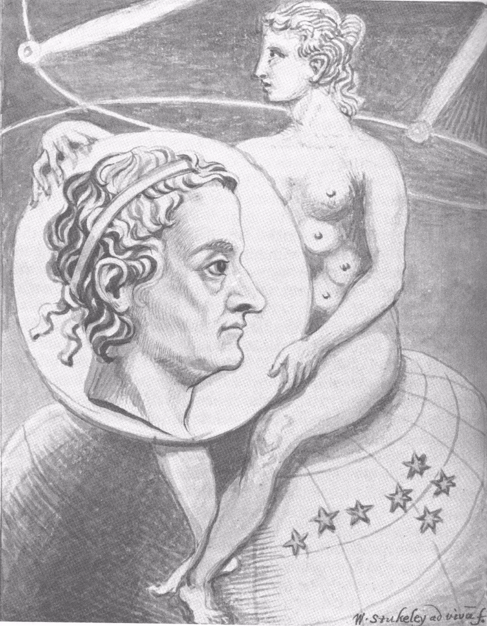 圣公会牧师斯迪克雷(William Stukeley,1687-1765)是一名古物研究者,以对英格兰巨石阵等史前遗址的开拓性研究出名,1718年当选为皇家学会会员。他是会长牛顿的超级粉丝,多年后(1752年,其时牛顿已殁)写了一本《伊萨克·牛顿爵士生平追忆》(Memoirs of Sir Isaac Newton’s Life)[题外话:也可称伊萨克爵士或伊萨克爵士牛顿,但不能称牛顿爵士],声称亲耳听到牛顿讲述自己目睹苹果落地引出灵感的故事,时间(新历1726年4月15日,牛顿逝世前约一年)、地点(伦敦肯辛顿牛顿宅)都言之凿凿。在此之前的1720年左右,这位好事的年轻同事画了一幅有关牛顿的素描,画中一位多乳女神坐在地球上,手捧着的月球表面绘有牛顿头像,画面中还可看见北斗七星与两颗彗星。