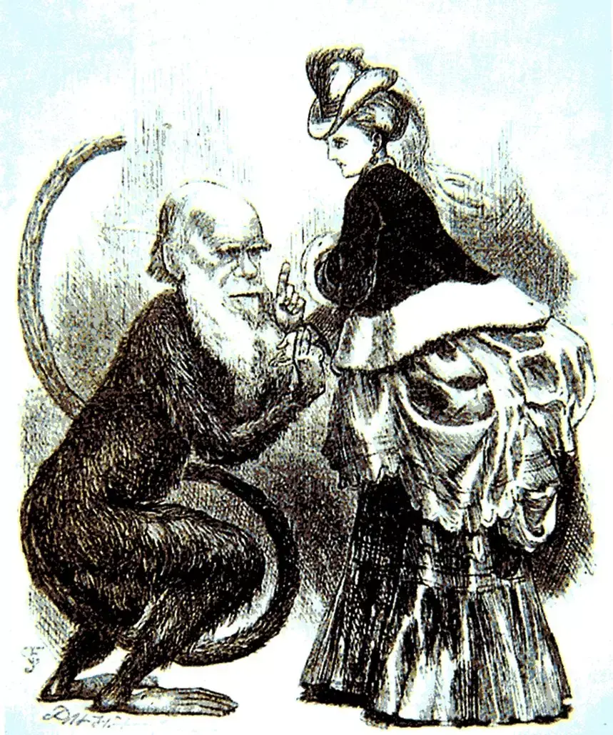 1859年达尔文的《物种起源》出版,不久就在社会上引起轩然大波,宗教界人士和受到影响的公众不能接受这一与上帝创造万物的信条悖逆的学说。在他生前与死后,西方媒体上出现大量有关达尔文及其生物演化学说的漫画,多数带有嘲讽挖苦意味,还有恶意的歪曲,也有少数表达善意的幽默图画。无论如何,这一类漫画的流行无形中助长了达尔文学说在公众中的传播。