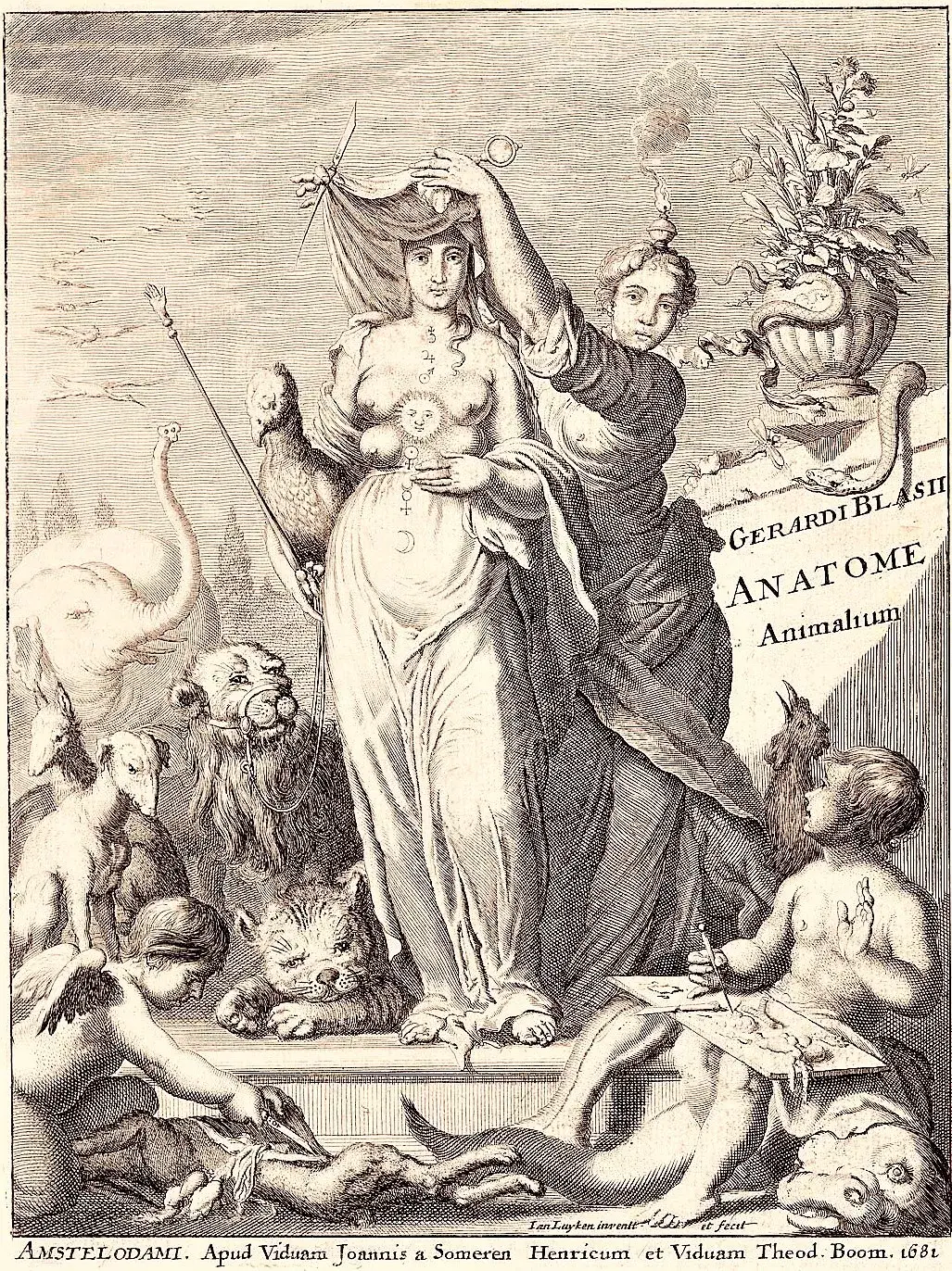 按阿尔忒弥斯(Artemis)是希腊的自然、狩猎和月亮女神,在以弗所的神庙中,有一尊阿尔忒弥斯女神的黑木雕像,其最显著的特征就是胸前长满了乳房。这一形象与埃及神话中的丰产女神伊西斯(Isis)有关,长久以来,揭开阿尔忒弥斯-伊西斯面纱是西方文化中一个隽永而内涵丰富的主题。对于科学家而言,其象征意义就是揭示大自然的秘密。下图为以弗所的阿尔忒弥斯女神像的罗马时代复制品;再下面是荷兰生理与解剖学家布莱修斯(Gerhard Blasius,1627-1682)《动物解剖学》(Anatome animalium)的卷首插图,一个代表科学的女子正在揭开代表自然的阿尔忒弥斯-伊西斯脸上的面纱。
