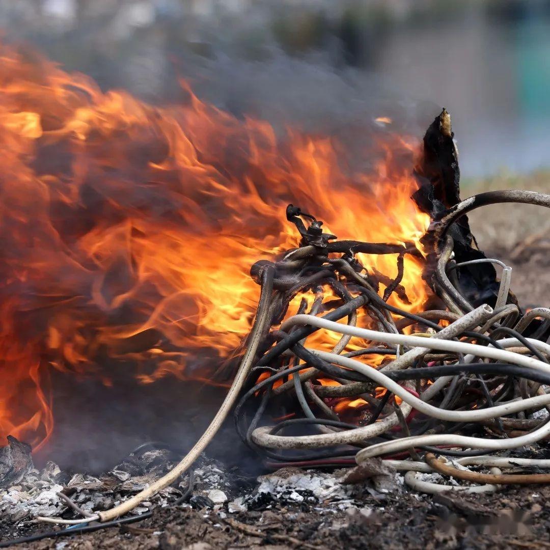 如今,湿地已经看不出原有的样貌,只剩下电子产品燃烧后留下的黑色灰烬、碎屑,以及经年累月层层堆叠的电子垃圾。空地上黑烟滚滚,人们拿着棍子翻滚燃烧的电子垃圾,用大塑料袋里的水灭火,取走剩下的余烬,清理出里面的贵金属。