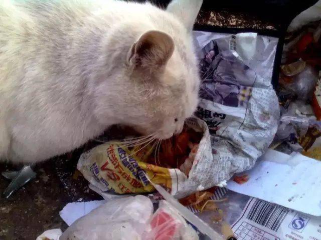 但是,冬天的流浪猫很难获得足够的食物,为了活着它们只好在居民区的生活垃圾处翻食…