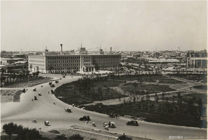 伪满时期的“大同广场”,圆形构造,始建于1932年,如今为人民广场,前方建筑为伪满电信电话会社
