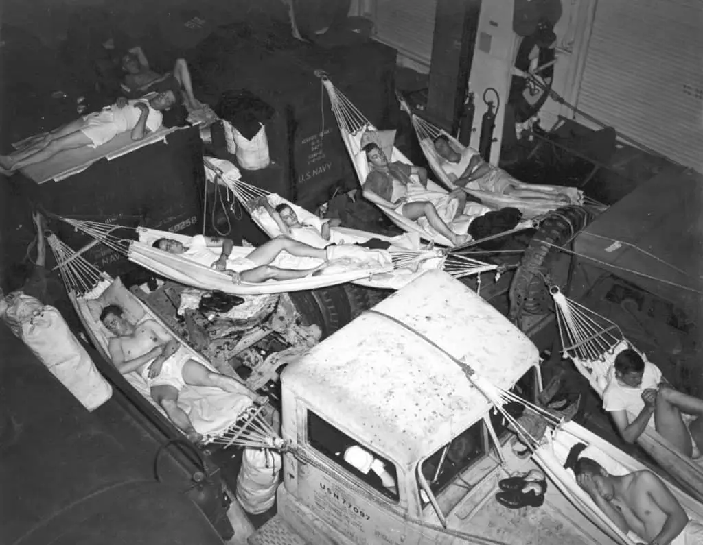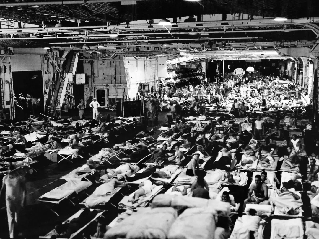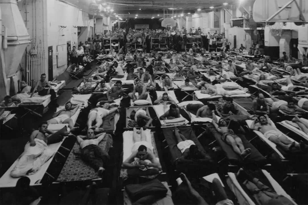“萨拉莫阿”号护航航母(CVE-96)机库如今已被密集的行军床和铺位占据。尽管空间拥挤,但只要能回家,没人在意。