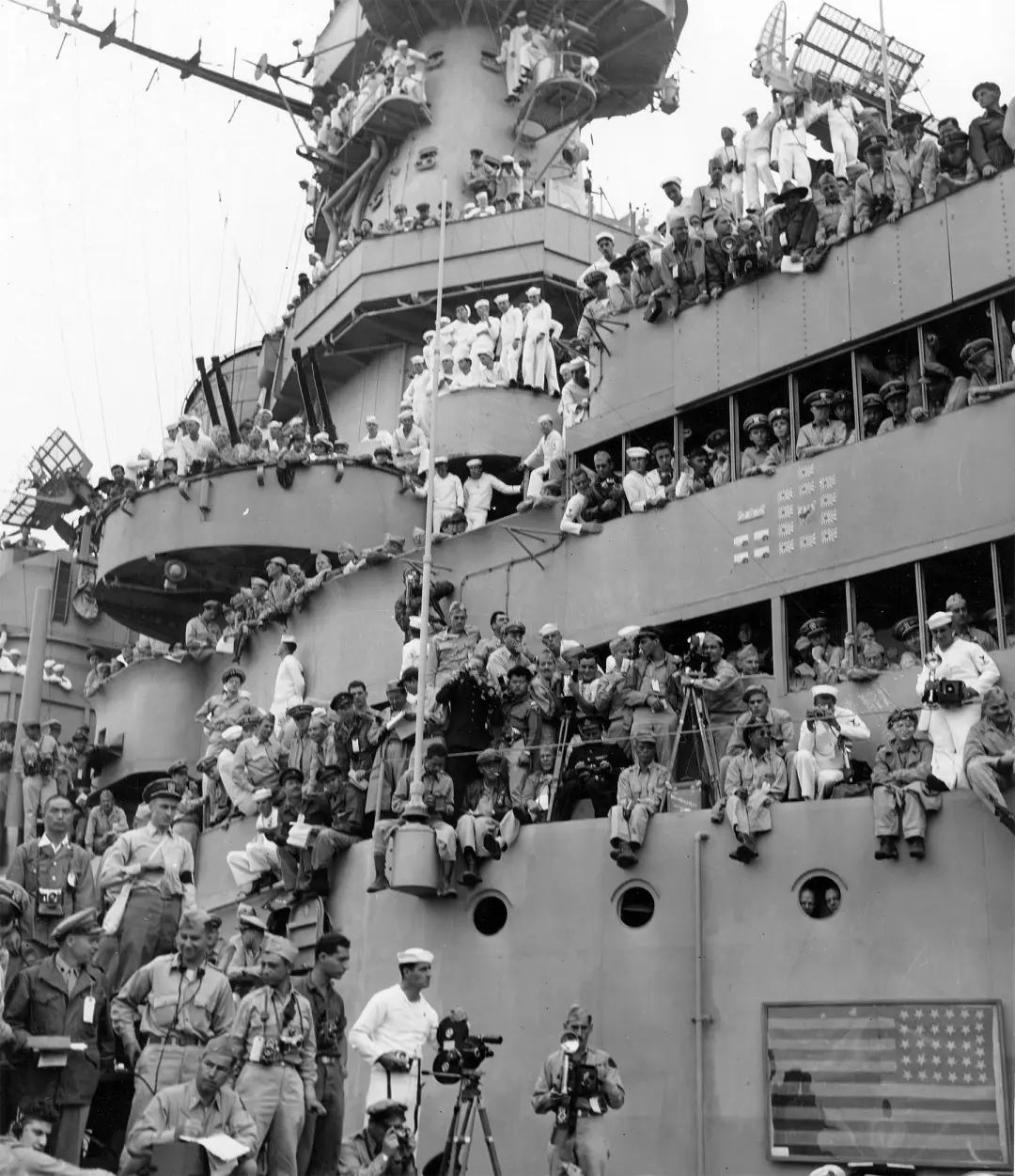 1945年9月2日,密苏里号战列舰的舰桥上挤满了观礼者和摄影师,共同见证日本投降签字仪式的历史性时刻。