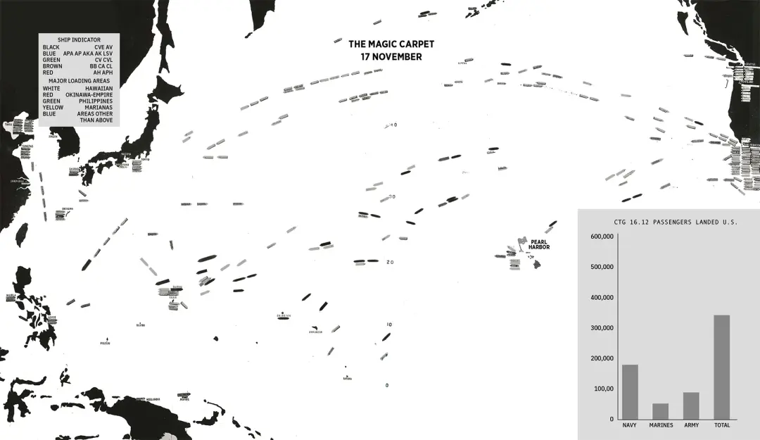 肯德尔和参谋团队划定了三个主要人员集结登船区:冲绳与日本、菲律宾、马里亚纳群岛,各分配约30%的运力。剩余10%运力分配给夏威夷、马绍尔-吉尔伯特群岛、南太平洋、韩国和中国等地区。11月至1月期间,”魔毯”舰船还实施”区块分配”制度,优先运送陆军或海军陆战队人员。