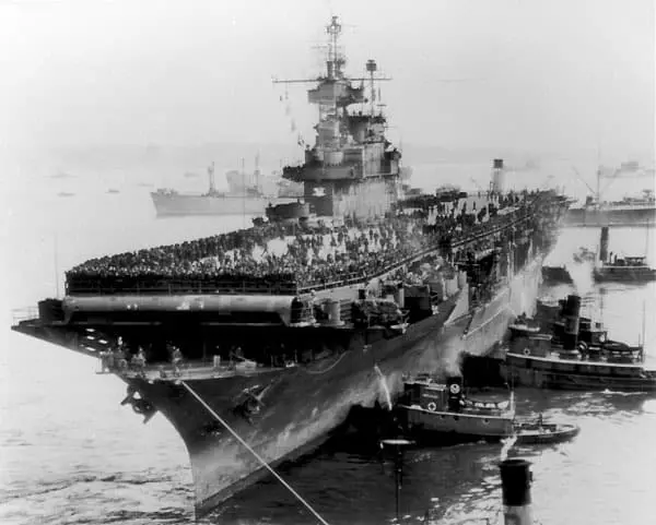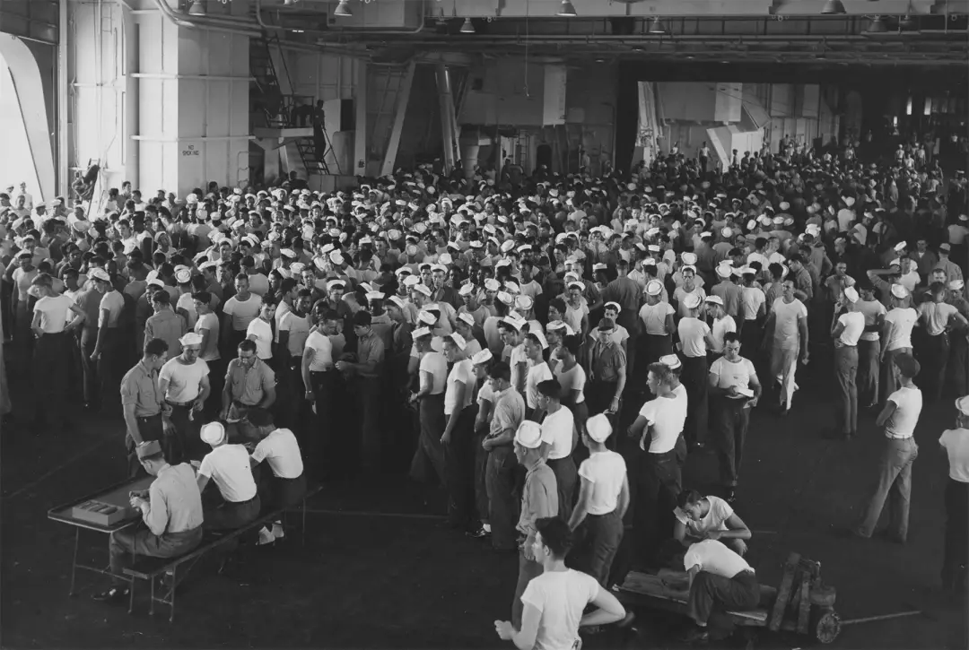 1945年8月下旬,企业号驶抵夏威夷珍珠港,机库内挤满了1141名归国军人