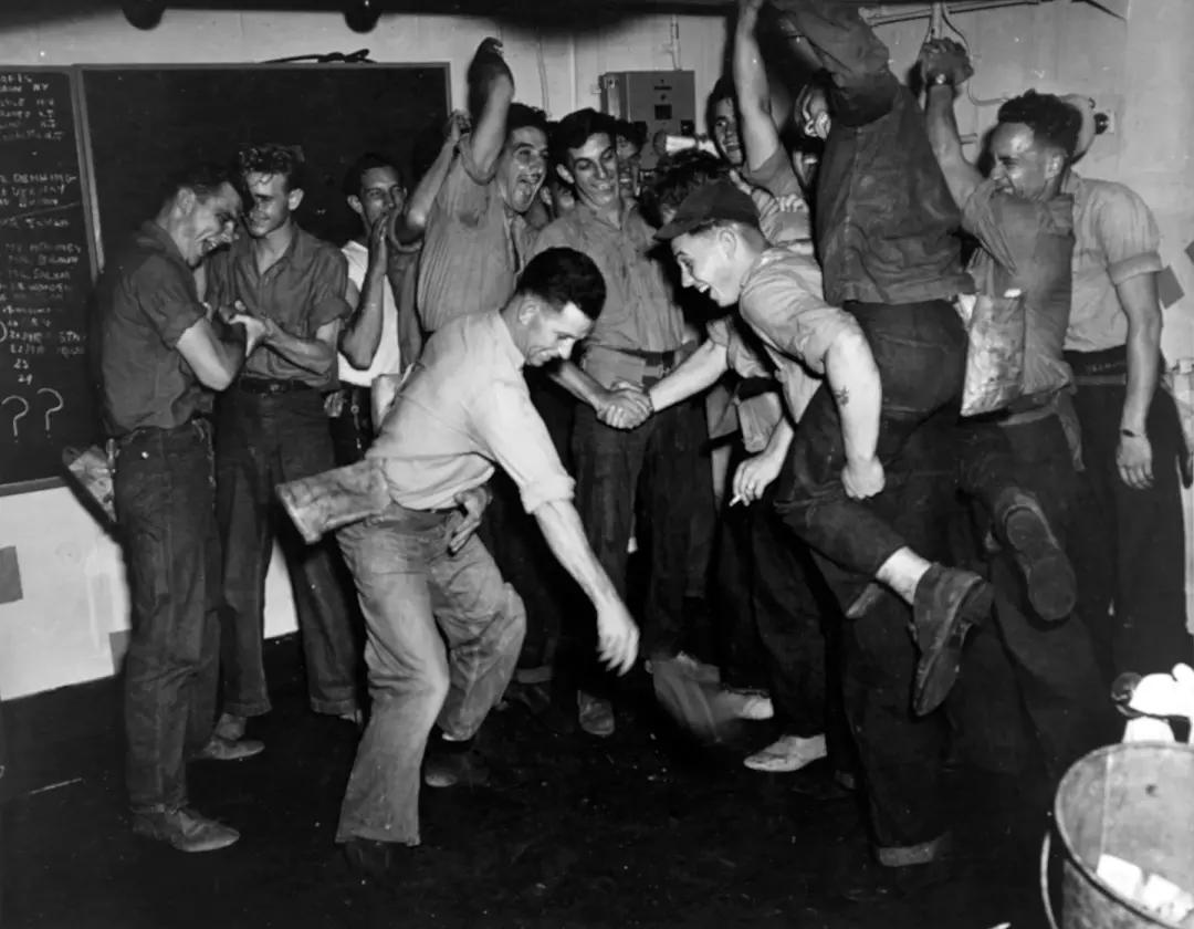 1945年8月14日,布干维尔号护航航母(CVE-100)的船员们收听日本投降公告后欢呼庆祝。然而,将所有美军人员从太平洋战区运送回国仍需数月时间。