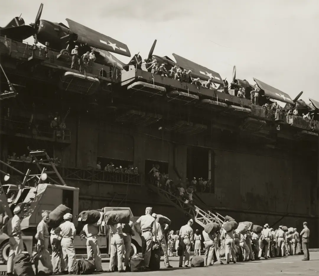 1945 年 10 月 16 日 “大黄蜂” 号正准备从珍珠港启航前往美国。当时这种大型航空母舰一次可搭载多达 8000 名归国官兵。