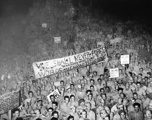 1946年1月, 延迟归国带来的沮丧情绪导致多起军人大规模示威。在马尼拉,2万名士兵冲击陆军总部,怒吼淹没了试图解释延迟原因的军官。檀香山、关岛和缅甸也爆发了抗议(尽管纪律出现空前松懈,军方最终未追究责任)。但大多数人仍在平静等待。