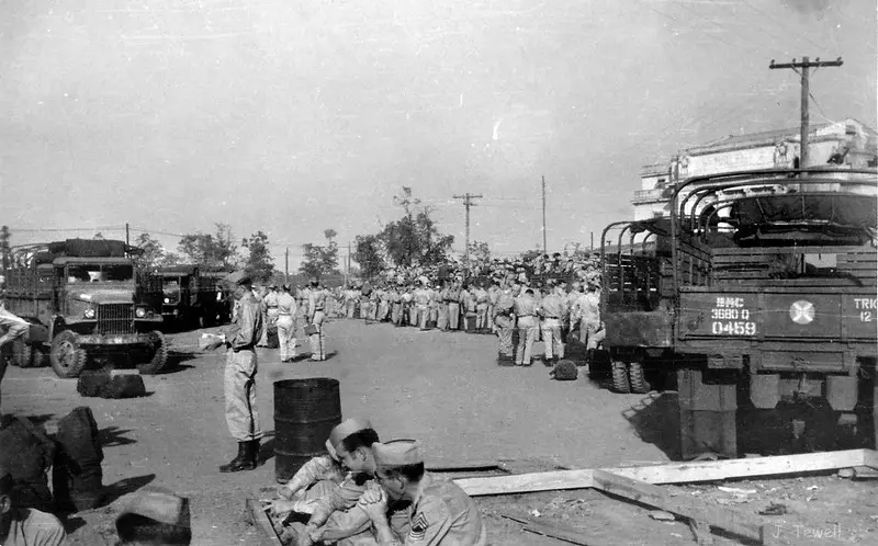 1945年10月15日,珍珠港码头上,士兵们列队准备登上提康德罗加号航母(CV-14)。