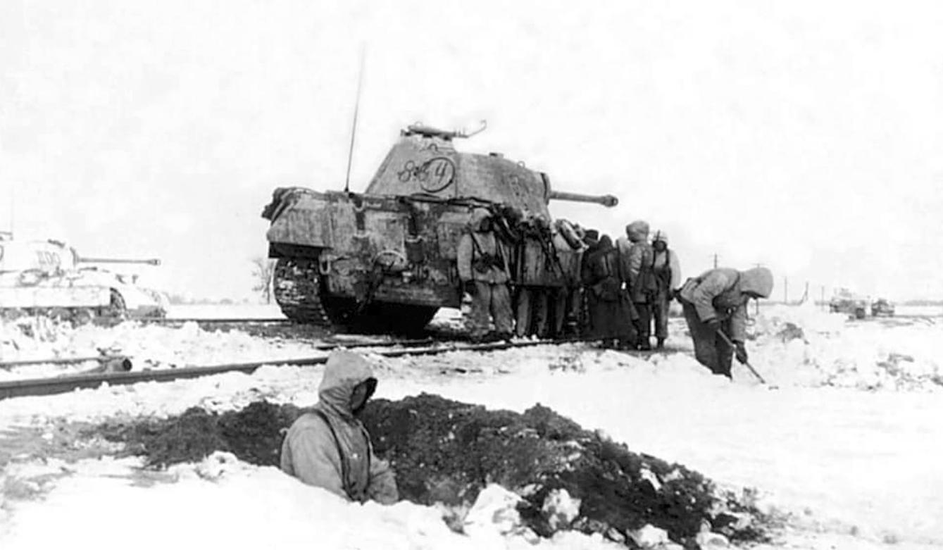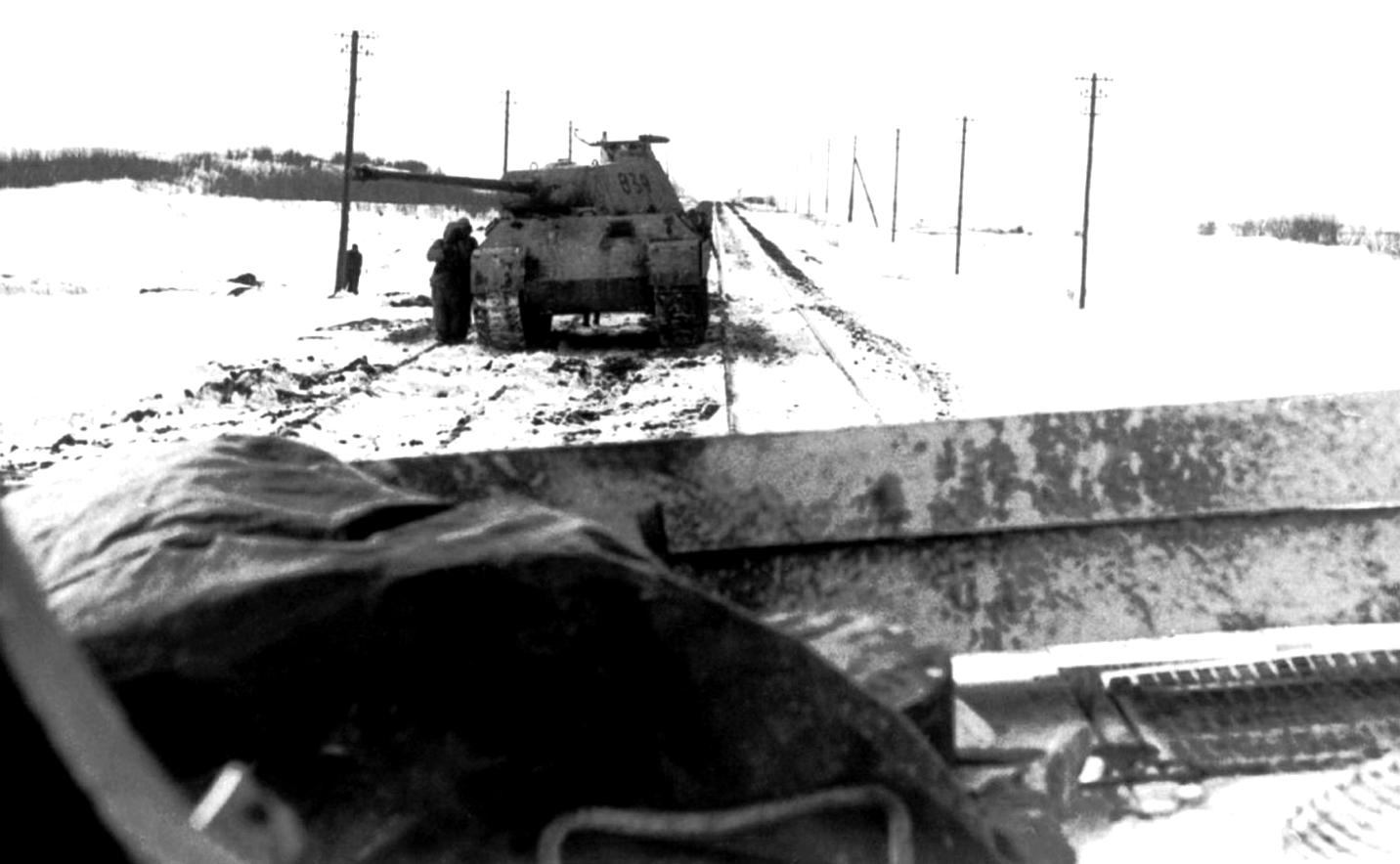 大自然永远是公平而中立的。不久之后,降雪加剧,原本就十分恶劣的能见度跌至谷底。由于视野不佳,第8连错误地驶入铁路线右侧一处布满弹坑的沼泽地,5辆“豹”式陷入泥沼,动弹不得。毫无疑问,仅凭自身的动力,这些受困的“豹”式根本不可能摆脱沼泽的束缚。尼科卢西-莱克很快就想到该如何最大化地利用好这些“豹”式——他下令让受困“豹”式留在原地,从森林中用炮火掩护第8连其余部队的右翼。