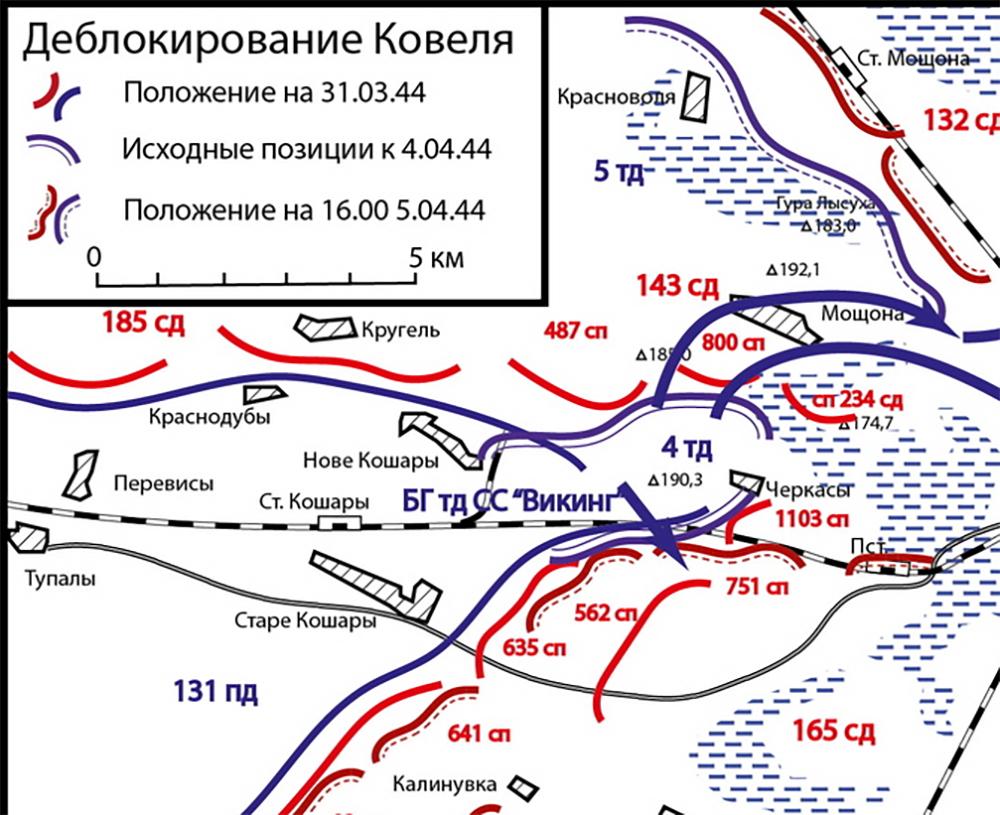 1944年3月31日至4月5日,科韦利地区态势图。图中蓝色为德军,红色为苏军。