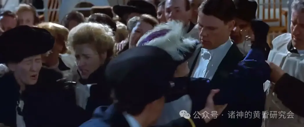 史实:乘客玛格丽特·墨菲曾指证说:“在所有三等乘客还有生存机会之前,船员就将三等舱的闸门和楼梯全部锁上,一群男子试图爬上更高的楼层、与那些船员们对抗,所有人都陷入混战、大声咒骂着。女人和小孩在一旁祷告或哭泣”。