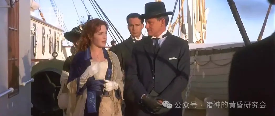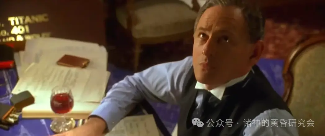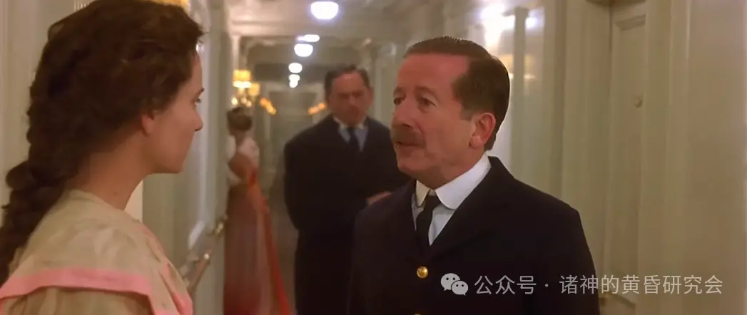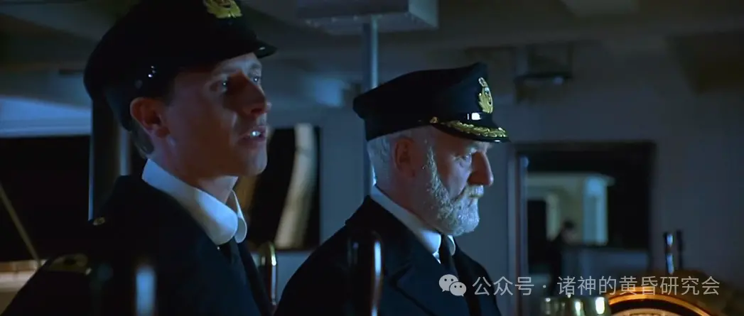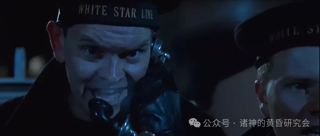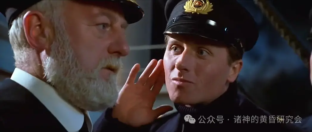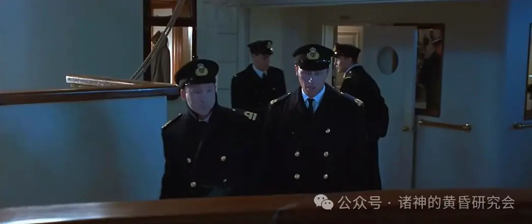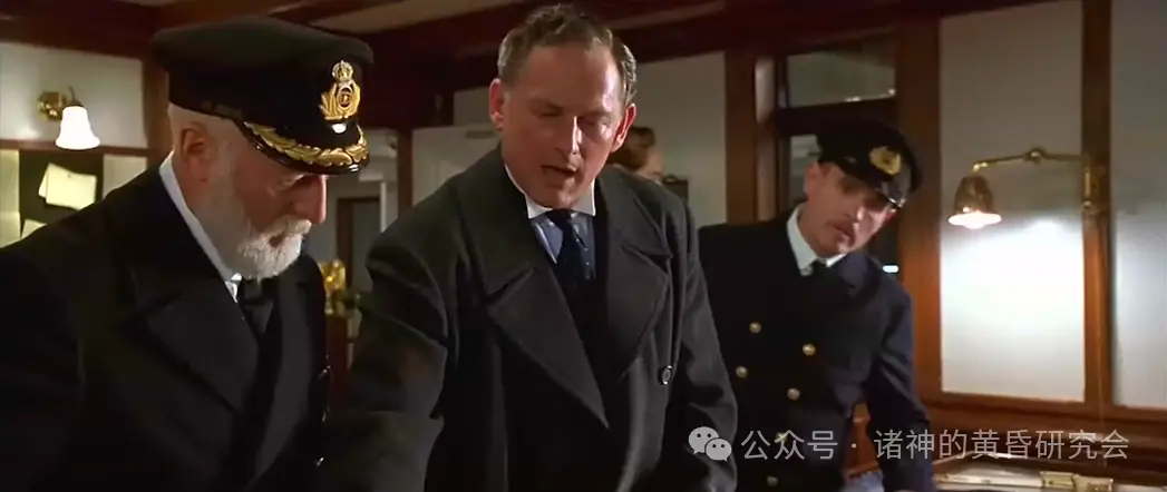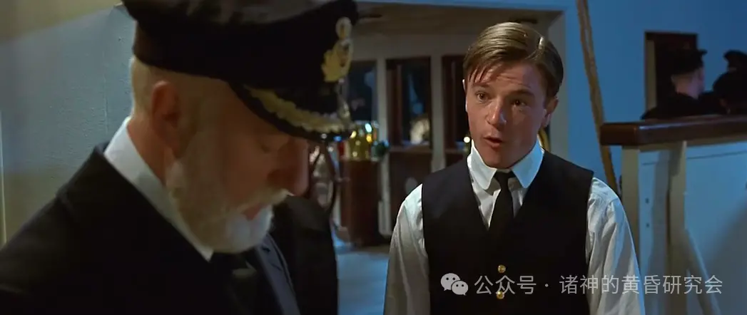 二副因为撞上冰山时在休班,所以他连衬衫都来不及穿,里面还穿着深蓝色毛衣,这在电影里忠实呈现。