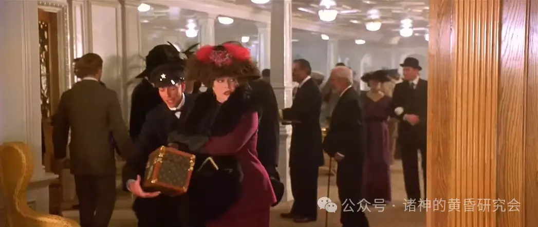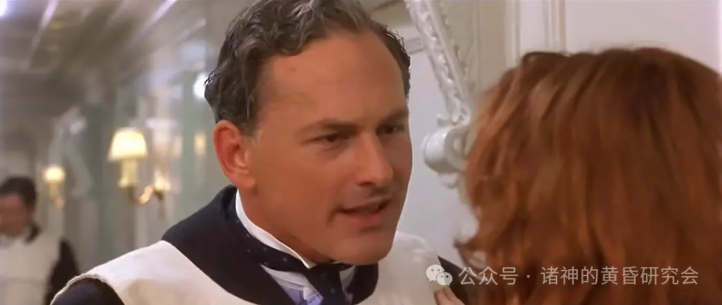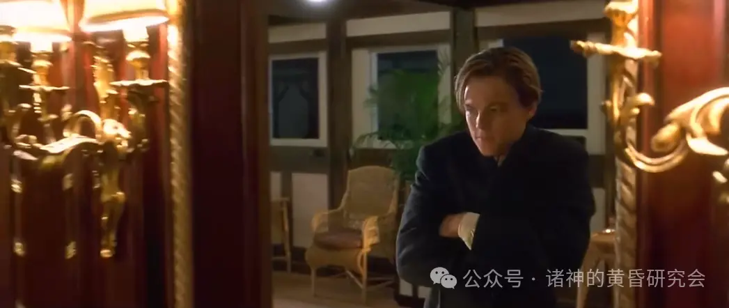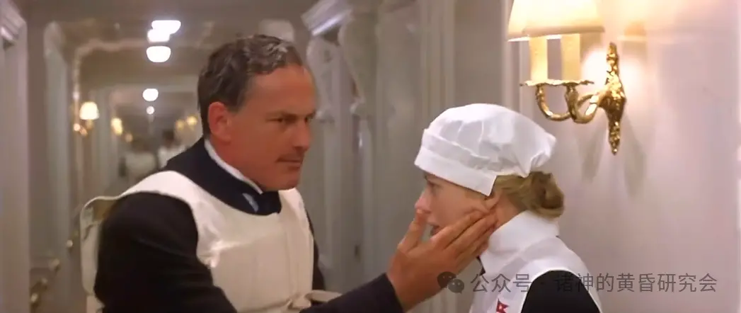 情节:杰克和萝丝为了逃生而撞破一道门,遭走廊上的服务员索赔。