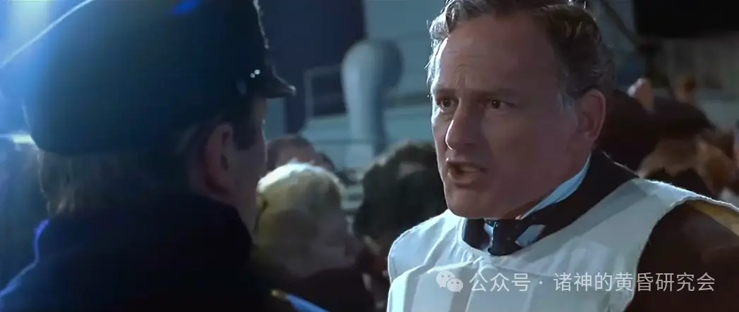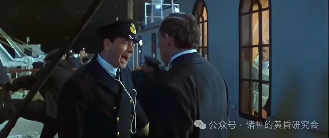 情节:二副查尔斯·莱托勒吼着问船长:“要不要让妇女和孩童先上船?”,但船长神情有些恍惚。