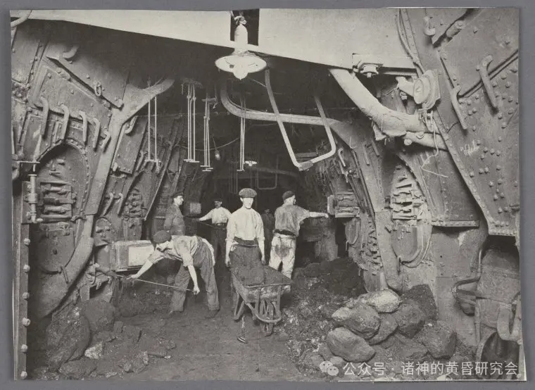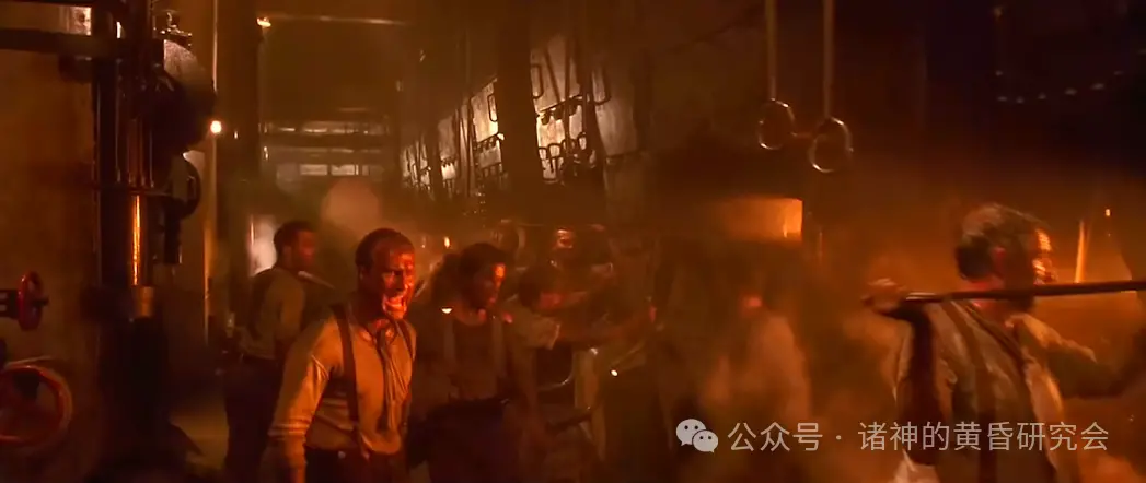 情节:工人在机房中铲煤生火,彷如但丁的《神曲》地狱篇。