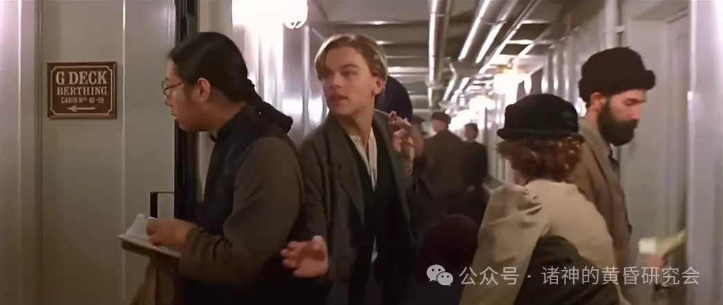 史实:G层甲板是”泰坦尼克”号位置最低、房间票价最便宜的甲板。当时船上有许多三等舱乘客来自黎巴嫩、叙利亚和斯堪地纳维亚半岛,也有8名香港男子。被杰克打招呼的室友则是由瑞典籍演员安德斯·福尔克(Anders Falk)客串。