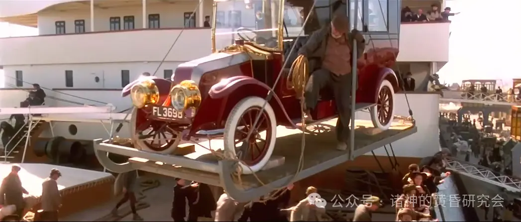 情节:”泰坦尼克”号停泊在南安普敦港准备出航,一辆车牌FL-3698的红金配色汽车吊挂上船。
