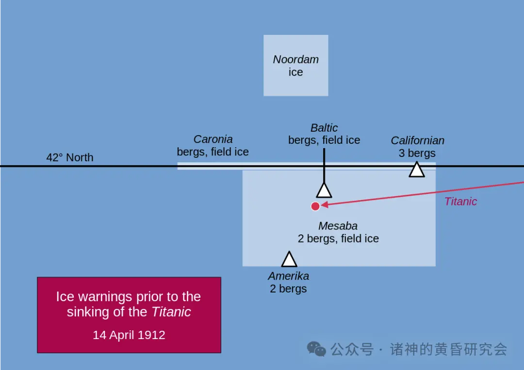 1912年4月14日,海难发生前的冰山警告(Ice warning)