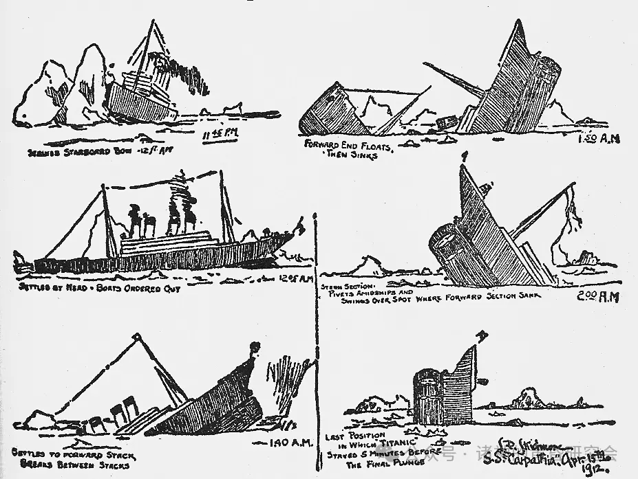 根据头等舱的幸存乘客杰克·塞耶的描述绘制的沉没过程。