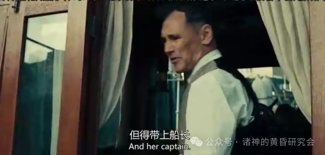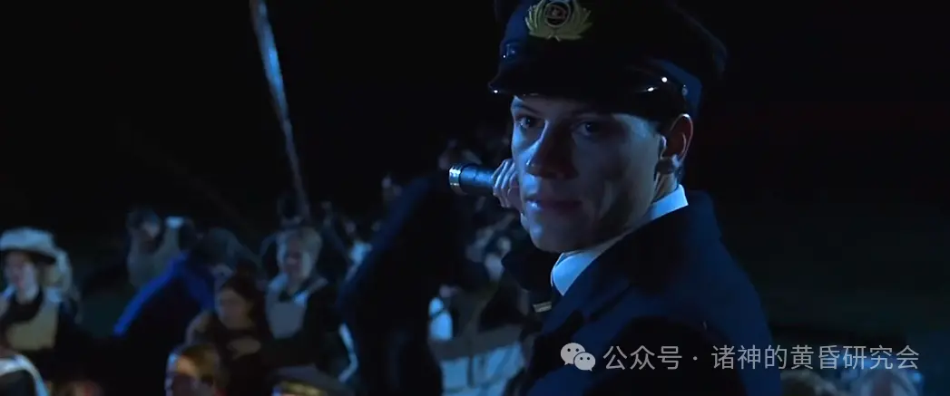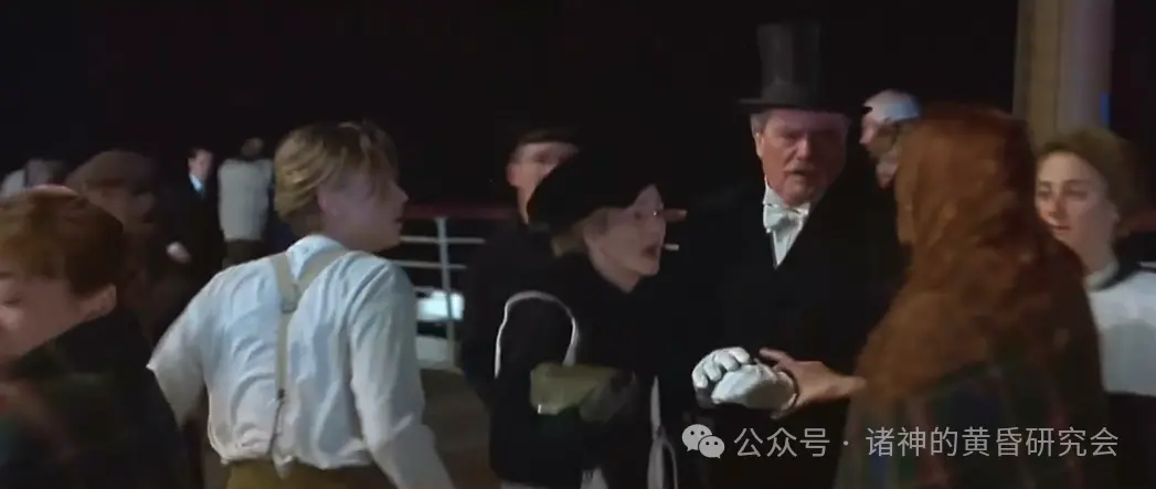 情节:杰克和萝丝来到小艇甲板,然后向格雷西上校询问:“另一边还有救生艇吗?”,格雷西上校双手各挽着一位女乘客。