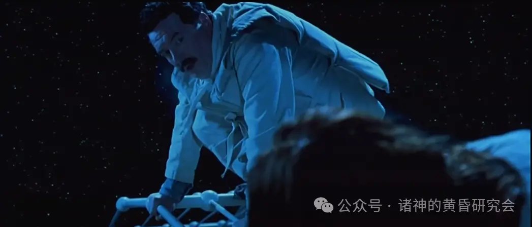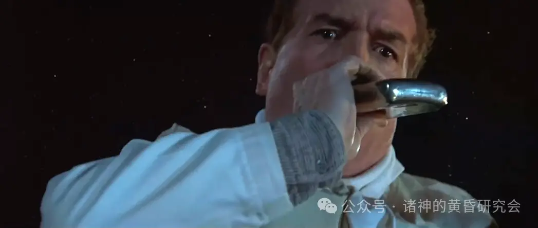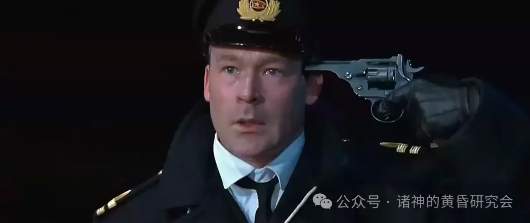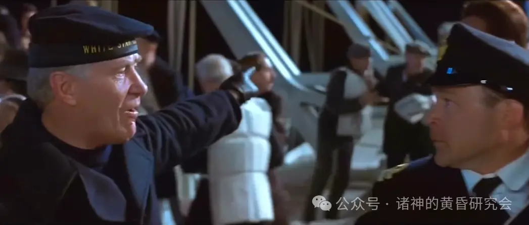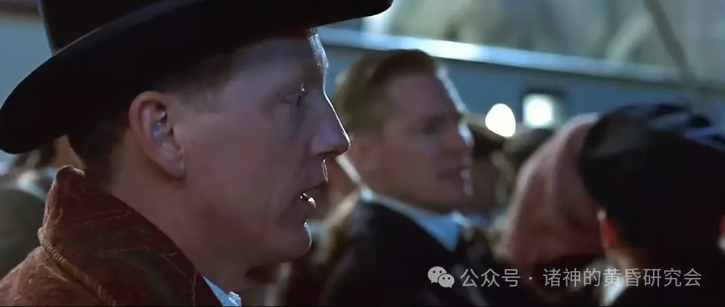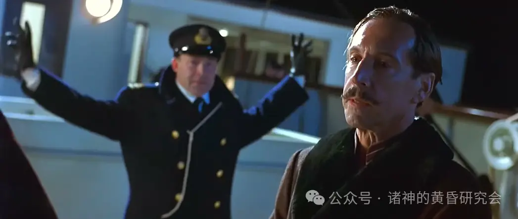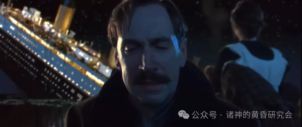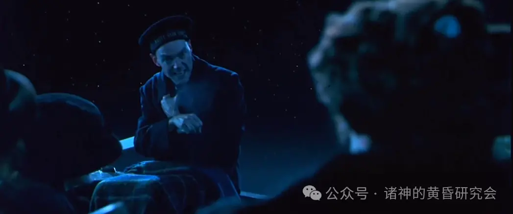 情节:在救生艇上的布鲁斯·伊斯梅表情崩溃,转头过去,不敢目睹”泰坦尼克”号最后的沉没场景。