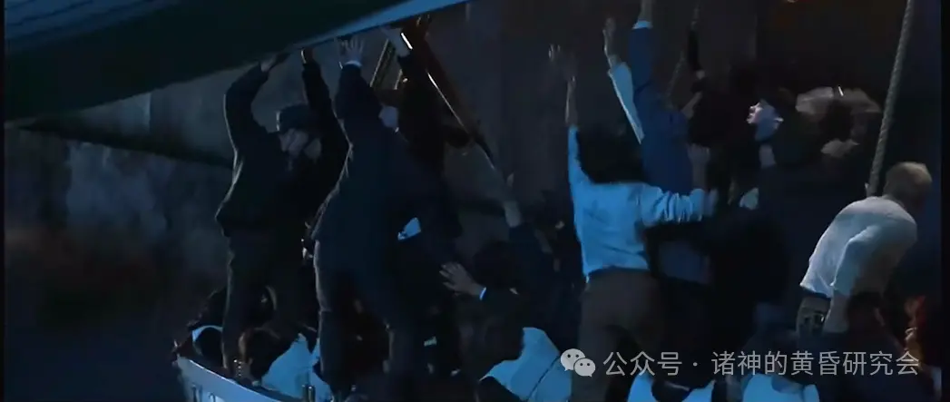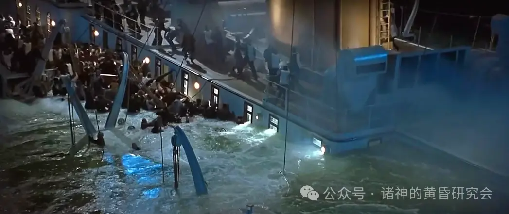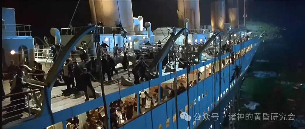 情节:大量人群恐慌的朝着船尾逃生。